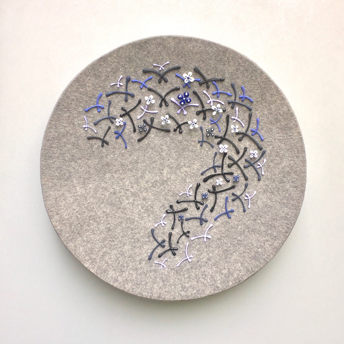 Vilten wandsculptuur met "zwevende" porseleinen elementjes