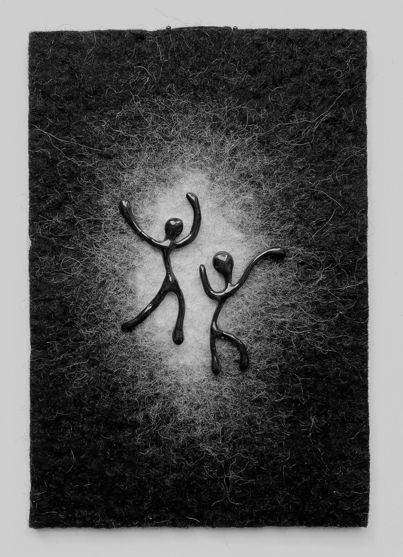 Vilten wandsculptuur met porseleinen figuurtjes